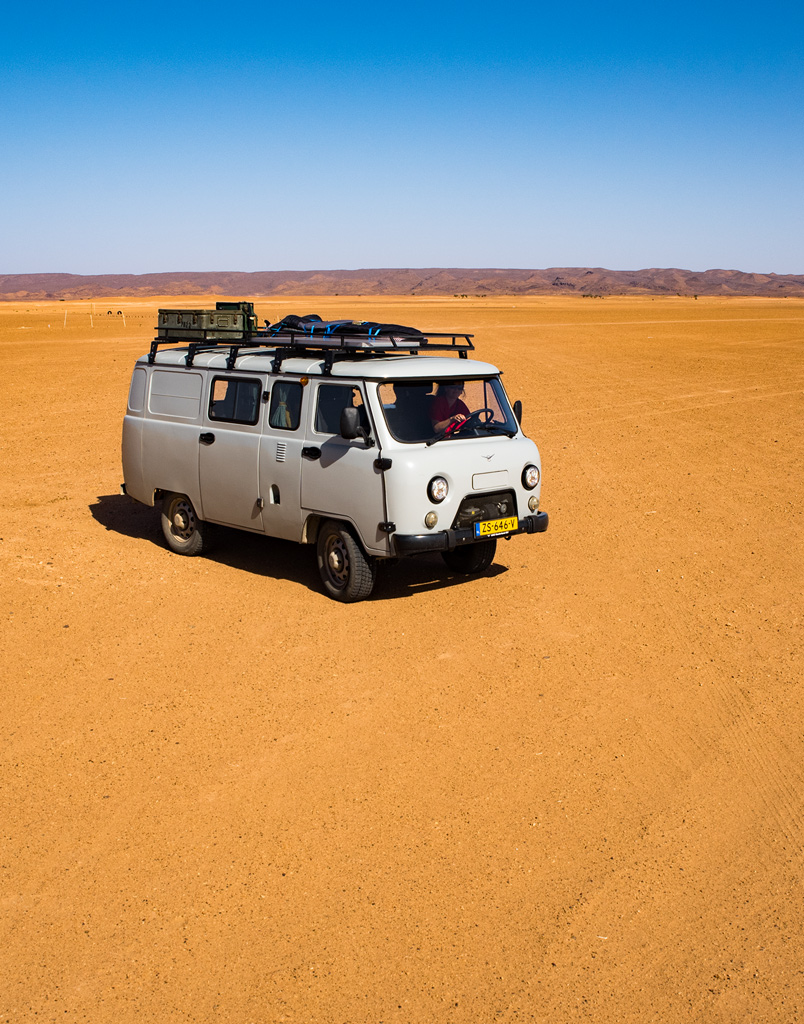 Maar hoewel de UAZ piepte en kraakte alsof het een lieve lust was, denderde hij moeiteloos over de groffe stenen en door het mulle zand van het meedogenloze woestijnlandschap. Meerdere keren vroeg ik mij af of ons zelfgetimmerde interieur er aan het einde van de dag nog in zou zitten na al dit offroad-geweld, maar we hadden afgesproken de schade pas op te nemen zodra de bestemming voor de nacht was bereikt.